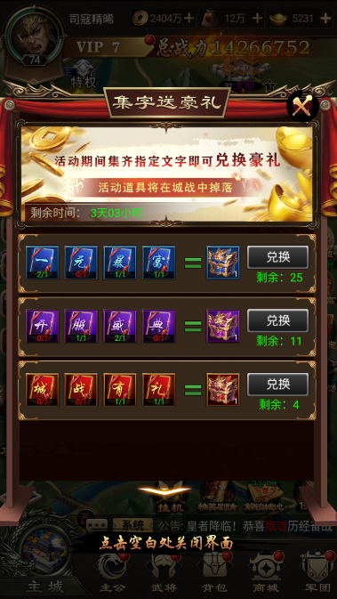1、新服开服会有集卡兑换活动,集齐五种字可以兑换一个元宝礼包,兑换的元宝礼包品质有三种,有机会赢取8888元宝大礼。