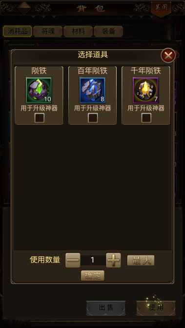 2、神器:兑换方法同陨铁,不过不建议大家在背包中兑换,容易兑换错神器,推荐大家在神器提升界面使用。