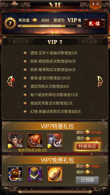 1、到达指定VIP等级之后可以购买VIP专属礼包,根据礼包不同可以购买的数量也不一样。