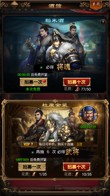 1、酒肆抽卡:酒肆只能抽到100资质武将,即使是半价抽卡也是不建议大家抽的,游戏初期会赠送大量的抽卡道具,这些 已经足够大家前期用了。