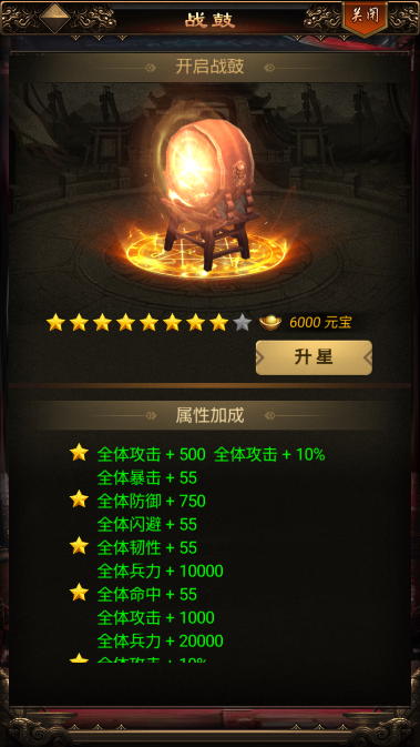 2、战鼓一共有九颗星,建议大家前期先把战鼓使用元宝升级了,后期战鼓提升的是百分比属性加成。