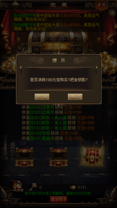 2、宝藏:参与跨服宝藏玩法可获得大量奖励,最高可获得元宝大奖。宝藏钥匙的价格会越买越贵,建议大家每天少量购买几次,等待第二天属性。