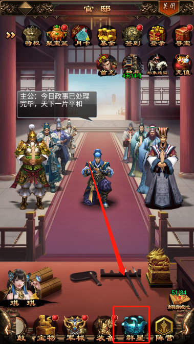 1、进入到游戏中的主公系统界面,滑动下边的菜单栏找到“将星”并点击。目前群英荟萃玩法有五大类,分别是无双魔神、星火燎原、中流砥柱、江东虎踞、赤壁分流,选择一个点击进入。
