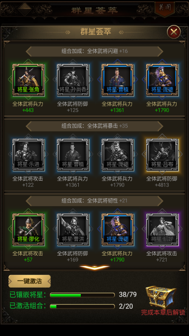 2、玩家可以手动一个一个激活,也可以点击一键激活。多余的将星可以在群英荟萃界面进行分别,分解后可以获得“将星之尘”。只有激活到一定的组合之后,才能解锁后续的组合。