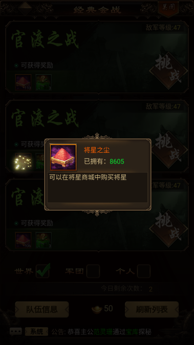 1、经典会战副本是专门获取将星之尘的地方,经典会战拥有游戏中比较经典的战役副本,副本的难度越高获得的将星之尘数量就会越多,同时还能得到战利品,战利品打开后有几率获得铜钱、特级经验书、宝物令、天工锤、以及2800的将星之尘(2倍奖励)。