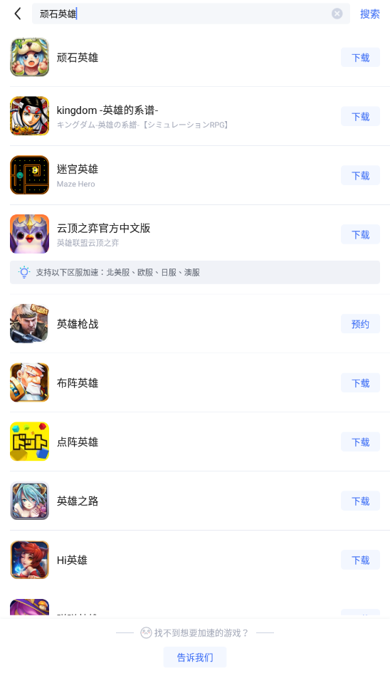 在Biubiu加速器右上角点击“搜索”,输入“顽石英雄”,确认结果无误后,点击右侧的“下载”,立即开始下载游戏包体。