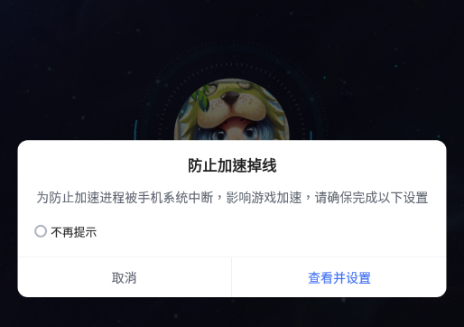 初次进入下图的加速界面时,系统会自动提示您完成相关设置,以保证游戏在加速过程中不会被手机系统中断。只需点击“查看并设置”根据教程步骤完成即可。