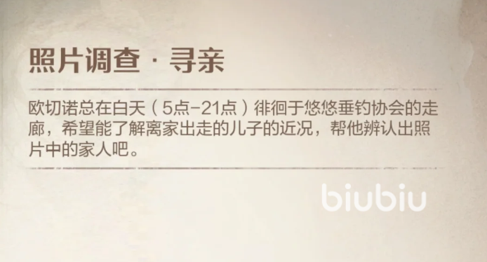 这个任务是要小伙伴们帮助欧切诺去了解自己离家出走的儿子当下是什么情况,需要在照片当中找出他的儿子,并且帮助相认。虽然在见闻任务中给的详情是欧切诺会徘徊在垂钓协会附近的走廊,但其实也不是在附近,所以大家还是直接根据图中指示去找就好了。