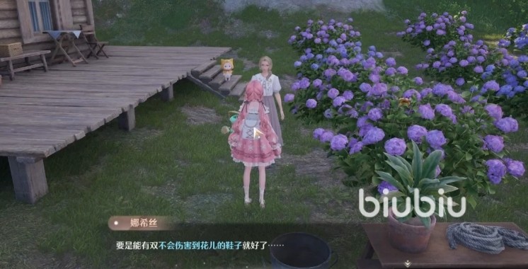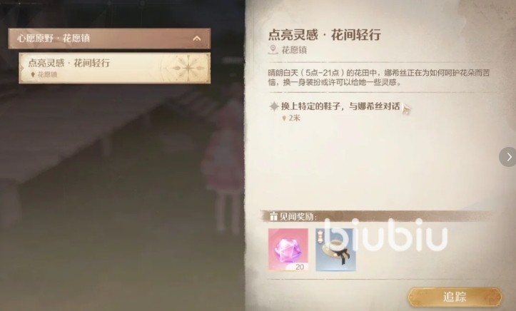 之后大家可以看一下任务详情,买好鞋子之后,小伙伴们需要去找娜希丝,她平时主要负责照顾花朵,最近却没了什么灵感,所以小伙伴们需要给她一点灵感,因此大家的背包里需要有一些灵感露珠,没有的话可以去地图上探索打一下,到处都有。