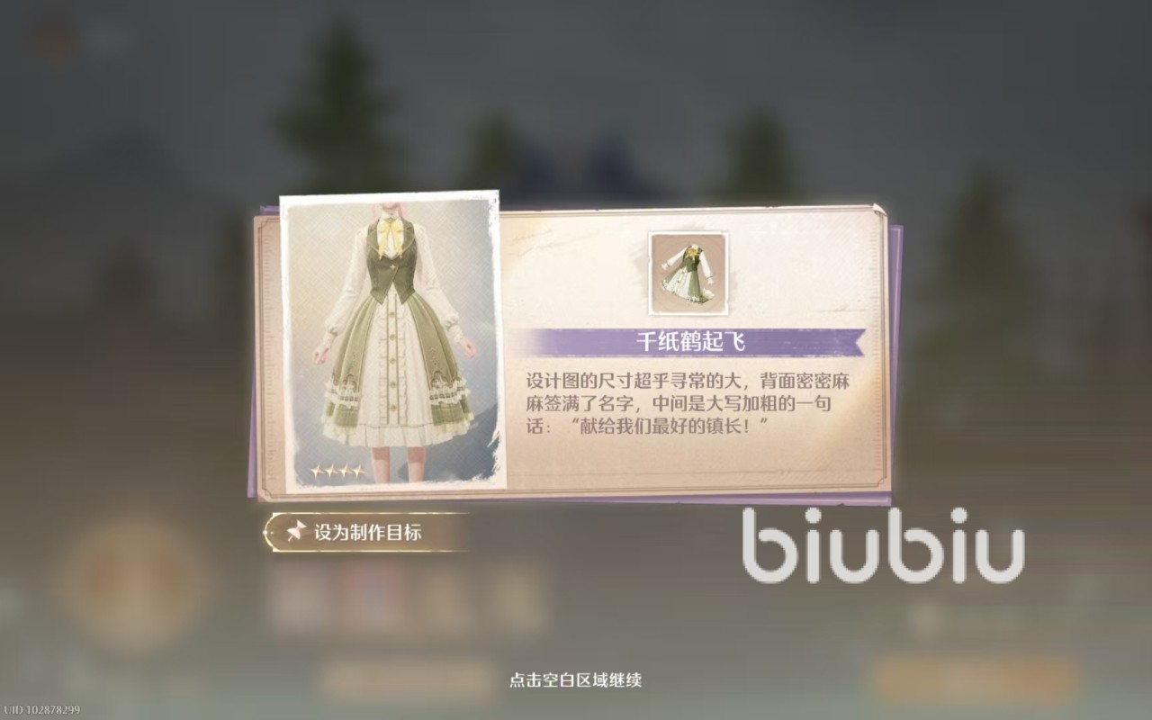 制作完“祈愿新生”的小裙子之后,我们点开地图传送到花愿镇的镇长宅邸前,到达这座宅邸前的雕像之后,穿上我们刚刚做的新裙子,也就是套装界面的“千纸鹤起飞”,与NPC艾柏进行对话之后就可以完成这个见闻任务啦!整个任务的难点在于灵感露珠的收集,整体难度一颗星,不过任务完成的收益小编觉得有四星哦!