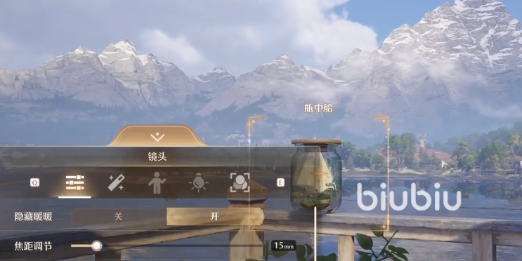 然后瓶子正对着的地方正好就有了船只,我们来到瓶子的右侧,随后点击相机按键,先慢慢拉动视角,将船和瓶子挪到一条直线中,完成后再调整相机的倍率,调整到四倍就够用了。