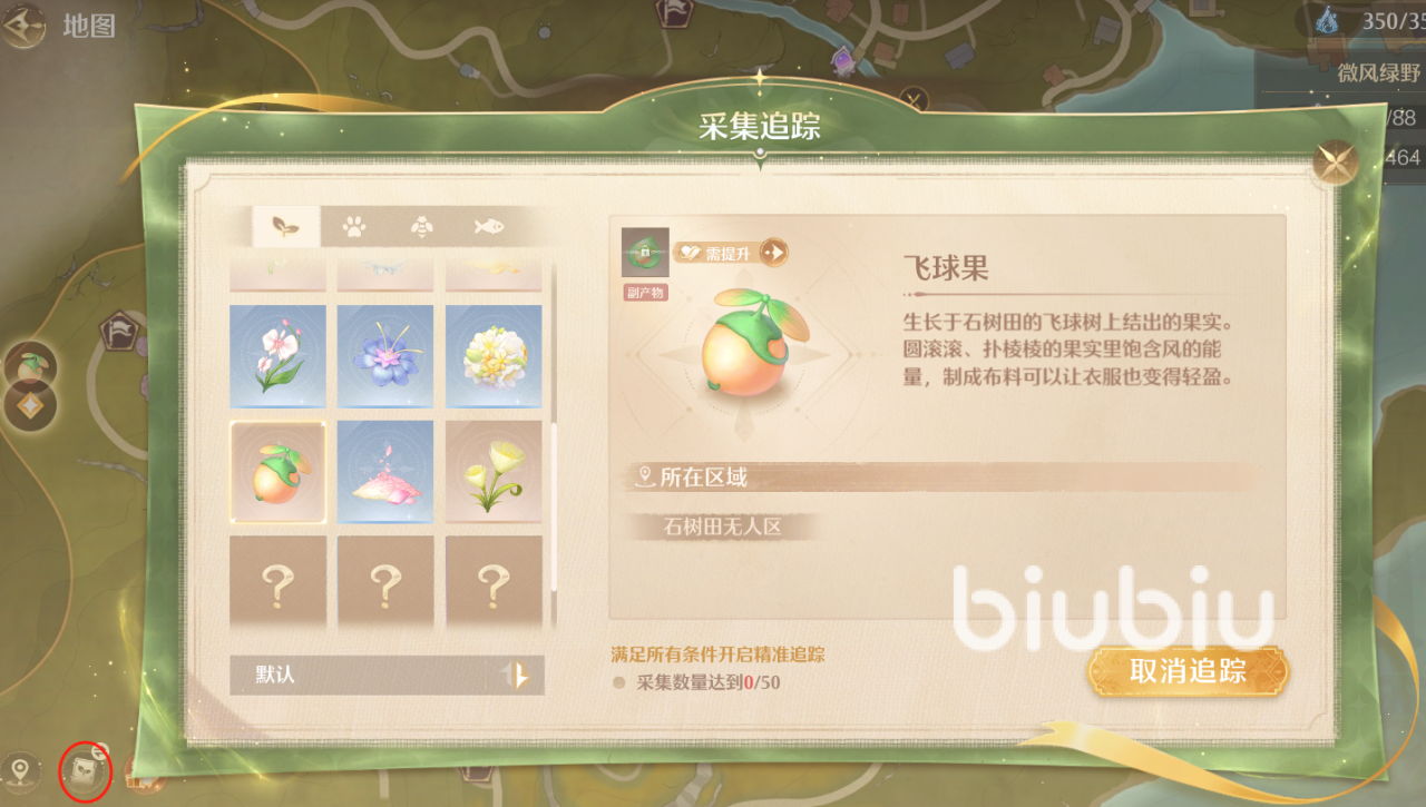 其实很多小伙伴都没注意到,地图是有一个追寻物资功能的,只要小伙伴们的采集数量达到50就可以开启,不管是抓鱼还是捕捉昆虫亦或者是捡植物,一起数量到达就可以使用这个功能了。大家打开地图,找到左下角的小树苗标志,点开就可以在分类里找到植物里的飞球果,点击追踪就可以在地图上观察看到它所在的区域了。