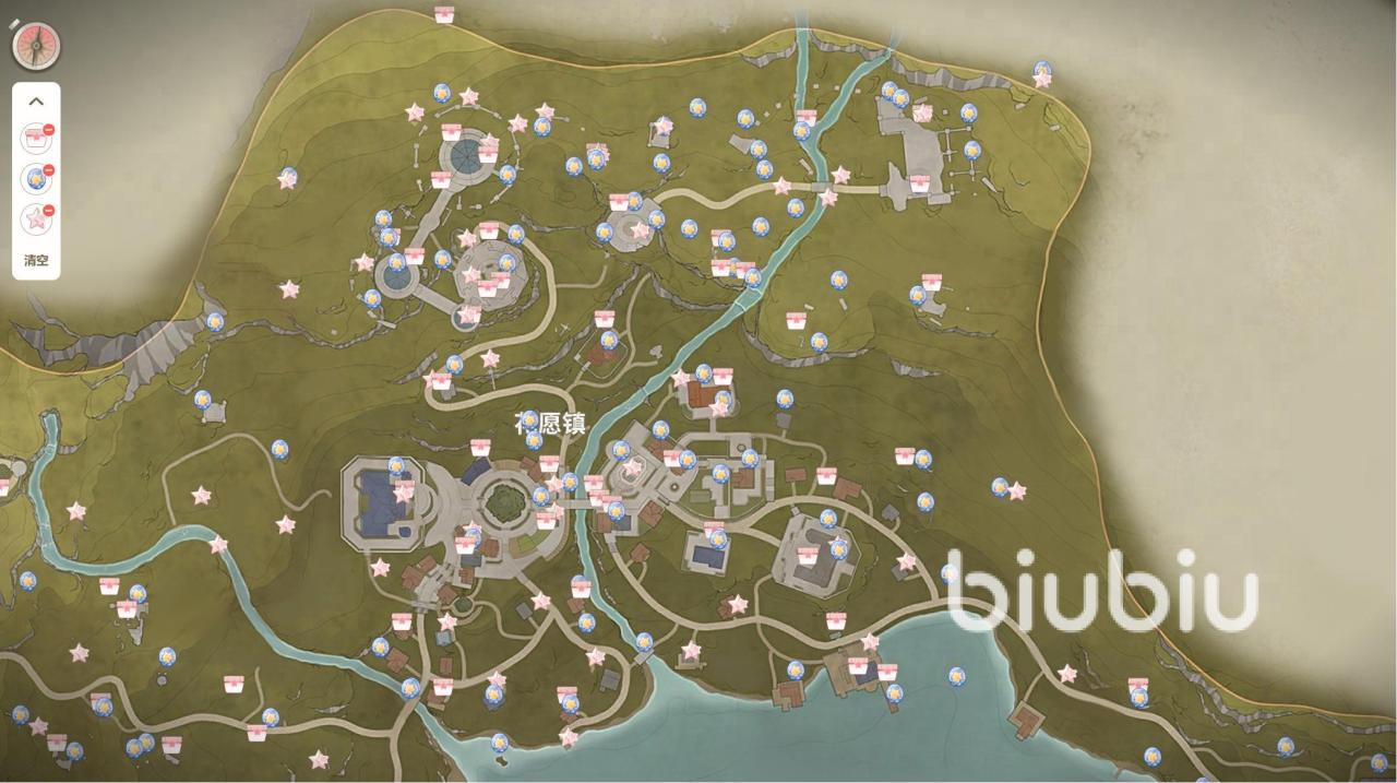 说完了这些东西的获取方式,那么接下来小编就给大家讲讲花园镇的各个收集点吧!粉色的星星图标对应的就是奇想星的位置,蓝色小水珠对应的则是灵感露珠的位置,至于宝箱的位置想必就不用小编多说啦。在花园镇中一共有67颗奇想星和302颗灵感露珠隐藏在花园镇的各个角落,大家可以根据地图上的点位去寻找哦!