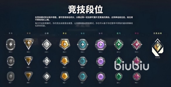 其实在这里的段位系统一共分为9个大段位,然后每一个大段位又分为三个小段位,其中一最低,三最高。这9个段位从低往上排的话,分别是黑铁、青、白银、黄金、铂金、钻石超凡神话以及无畏战魂。如果大家可以成为无畏战魂的话,那你的实力自然已经达到了最顶尖的一个行列。