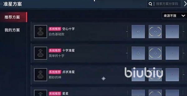 在“准星通用”里还可以点击右上角的“大神方案”,这里会有各式各样的准星方案供大家使用。无畏契约手游还有一个端游没有的功能,就是可以调节准星命中反馈,可以调节形状、图案。