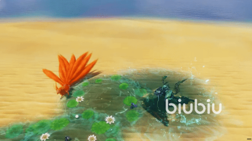 战斗技能”摘荷飞叶”,背部生长荷叶,旋转蓄力,之后扔很粗6枚荷叶攻击敌人,命中后会分裂攻击周围2名敌人,处于栖水游龙状态,蓄力时还免疫伤害;”中流击水”在短暂蓄力后,反复使用双臂拍打地面,之后跳跃空中,抽水花形成水箭攻击敌人,激活栖水游龙状态。