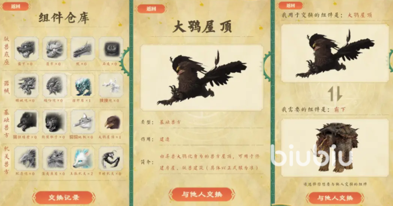 通过九游app预约,绑定角色后点击预约按钮,获取提醒资格并锁定奖励。领取组件,通过每日登录、邀请好友等方式获得不同“组件”,可在仓库查看作用并进行好友交换。选择本体、器械、基础兽方、机关兽方等,尝试组装出专属驮兽,甚至有机会获得SS级驮兽!