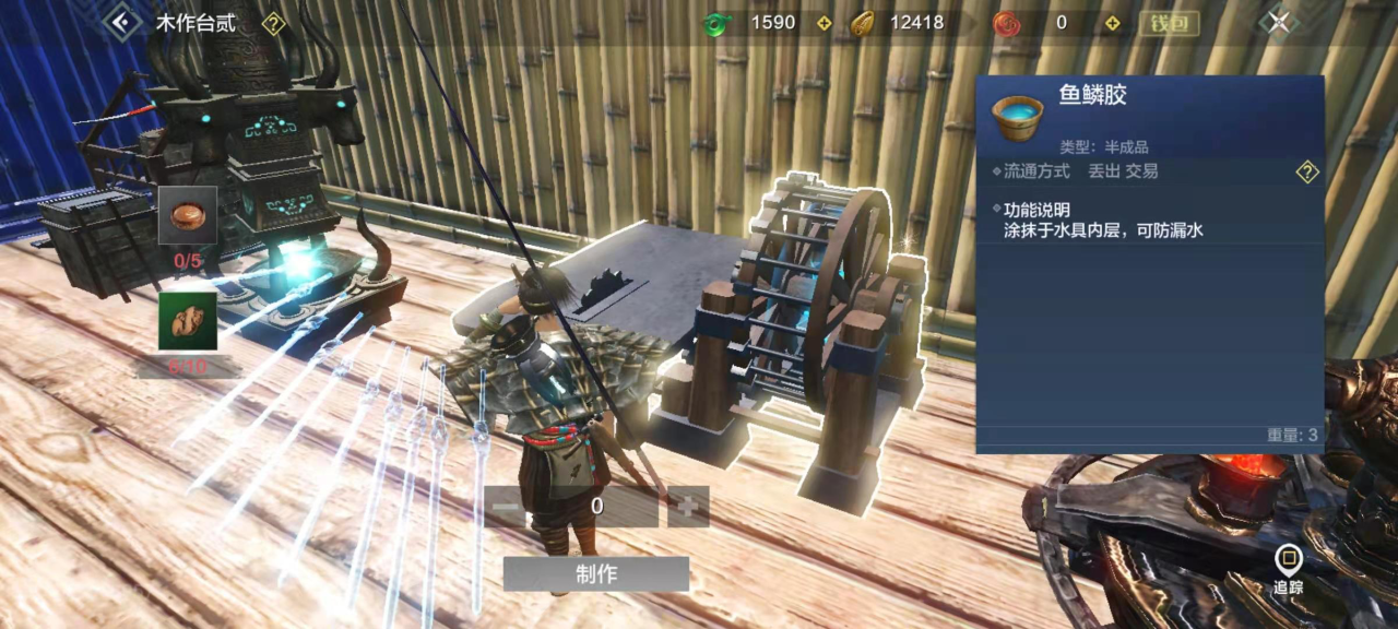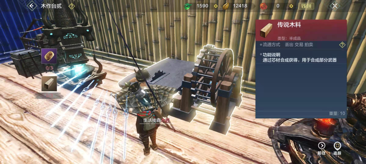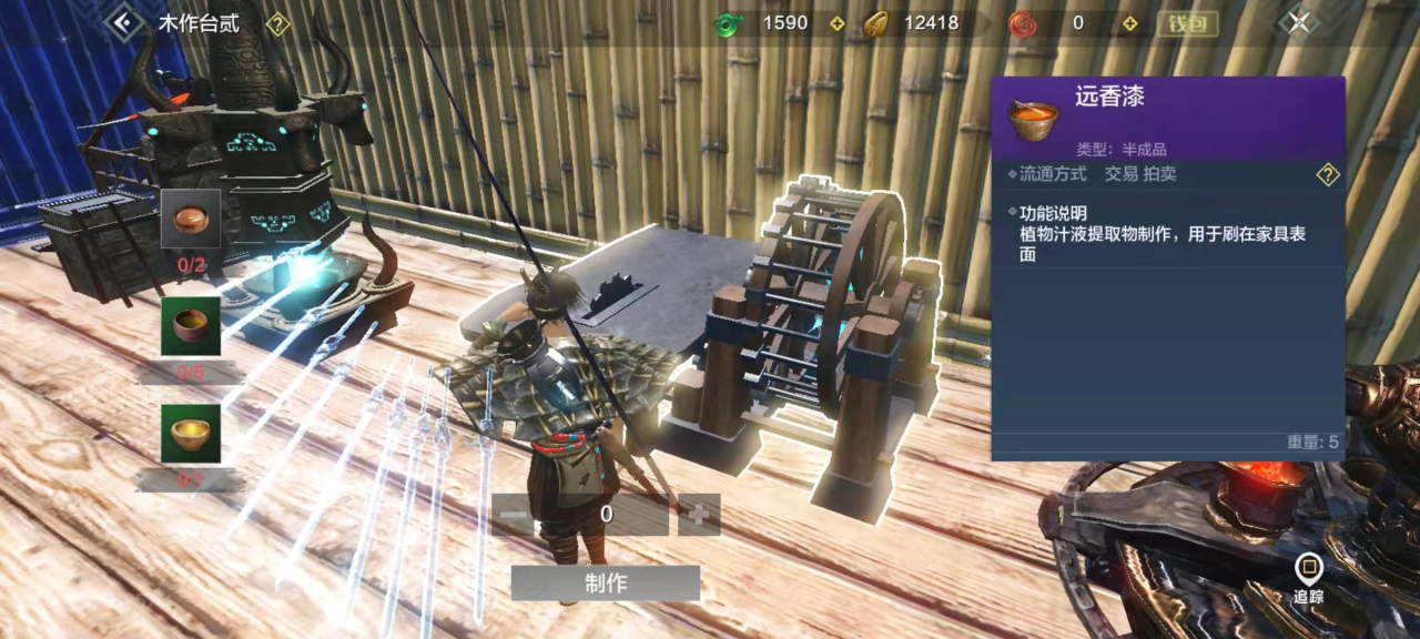 搞到了图谱之后就需要准备原料了,分别是传说木料、鱼鳞胶、远香漆等,其中传说木料需要在木作台处合成,每块传说木料需要三个胭玉和三块史诗木料,史诗木料也是又最基础的木头合成的,算下来每块传说木料消耗的都是海量的木头。