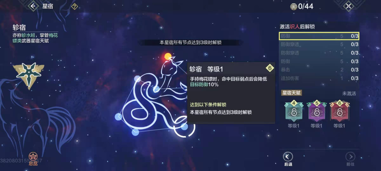 轸宿控制着梅花镖武器的天赋,可以增加防御、防御穿透和暴击、伤害追加等,是一个纯输出的天赋类,梅花镖这个武器使用的比较少,因为操作比较麻烦需要经验。但是增加了梅花镖的移动速度、普攻伤害和击中弱点后降低防御的效果。