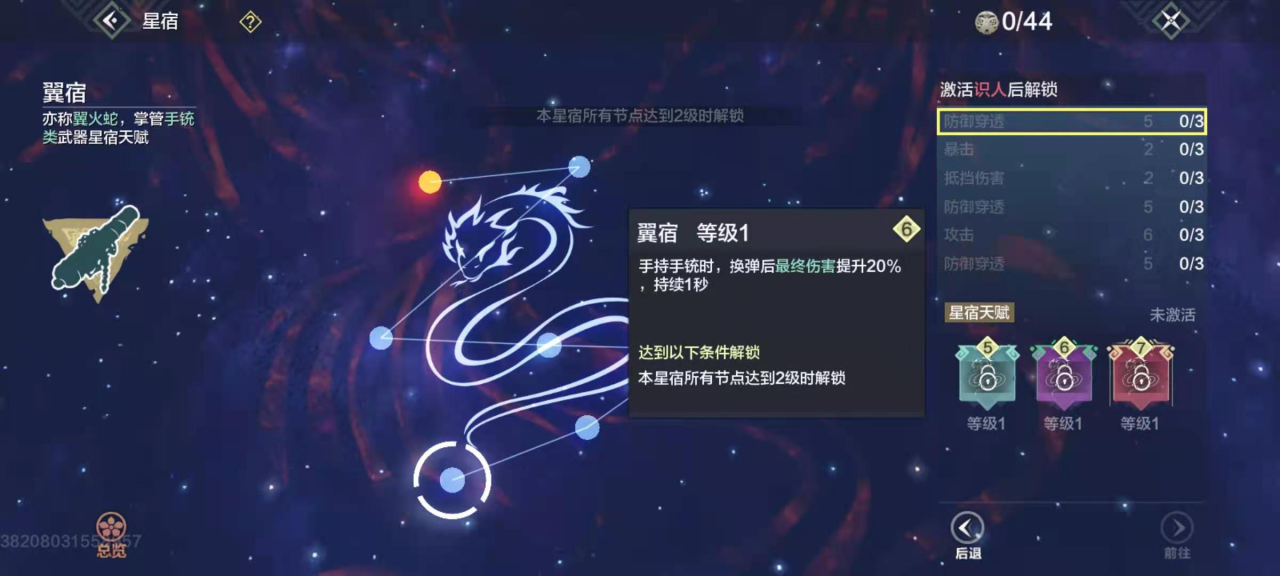 翼宿控制着手铳武器的天赋,增加防御穿透、暴击和伤害抵挡的属性,强化手铳武器效果,当血量大于半血时,提升武器伤害,提升换弹后的最终伤害以及减少装弹时间。朱雀星宿现在非常热门,因为远程类武器占据着主要地位,打百年、千年异兽远程武器占据着绝大部分输出,所以朱雀天赋是每个玩家都要了解的。