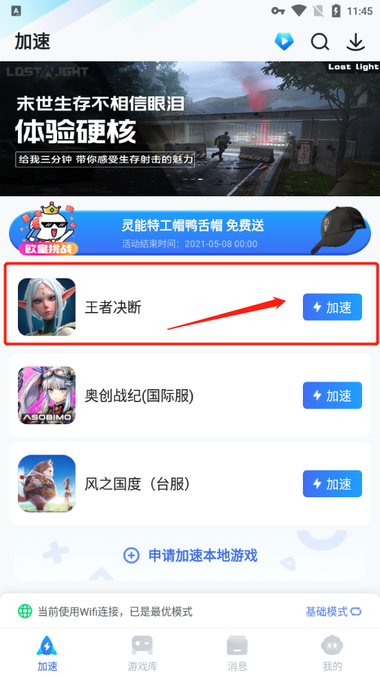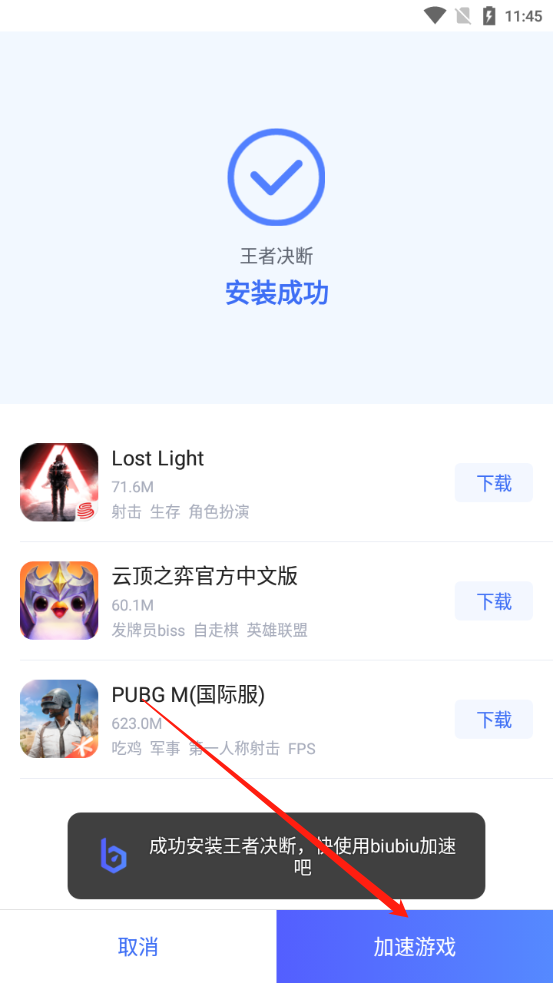 经过biubiu加速后大家再去玩王者决断就不会出现网络卡顿等情况了。此外,大家首次加速并游玩这款手游后,下次只需要从biubiu加速器的首页,即可对这个手游进行一键加速。