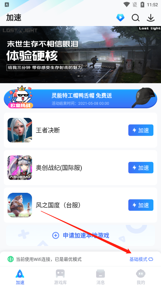 此外如果大家所处的位置离路由器比较远,导致wifi信号不稳定的话可以在biubiu首页下方,选择一下智能模式,这样可以最大限度的保障加速效果的稳定性。