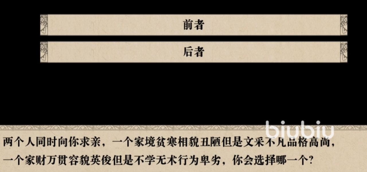 而第二个选项他高兴就好,则是会让未来的夫君的好感增加3点。第三个选择则是会让主角的智力+3,除了第一个其他两个都是可以选择的。在这里建议玩家们选择三,心智的加成肯定要高于好感加成。接下来的第三题,如果有两个人同时求婚,一个是出身贫寒但是文采不凡品格高尚,另一个有钱长得好看但是人品不行。选择前者的话那么才艺,品德,名声都会+3。后者的话则是容貌和女红+3,花用则是增加300点。