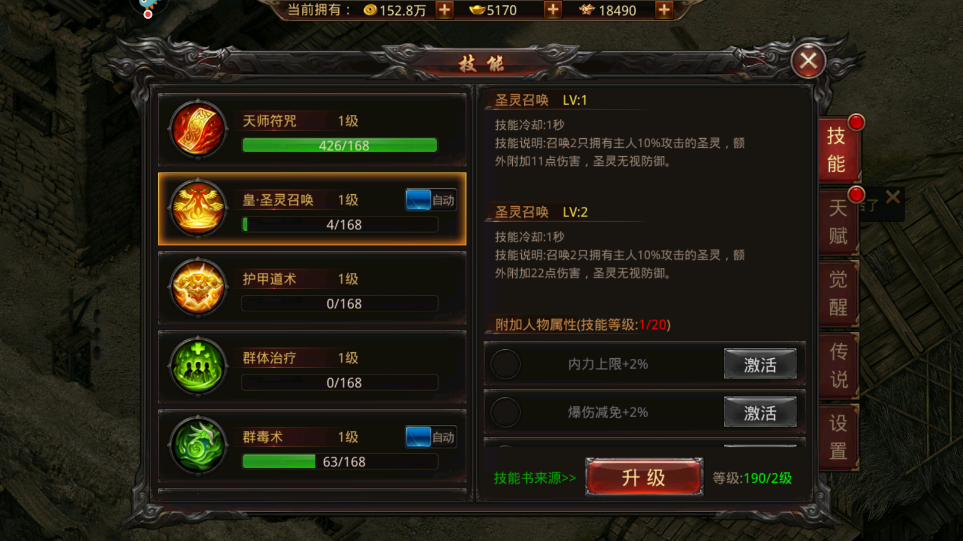 打法师的时候最重要的就是道士的神兽,道士主要起的作用就是给神兽套上护盾和属性增益,而神兽承担了前排、输出还有保护所有的作用,所以必须提升神兽的实力。首先是道士的技能增益,然后还要给道士本身提升属性值,因为神兽有接近一半的属性是继承玩家的。最后还有就是升级召唤神兽的技能,也能让神兽战斗力提升。