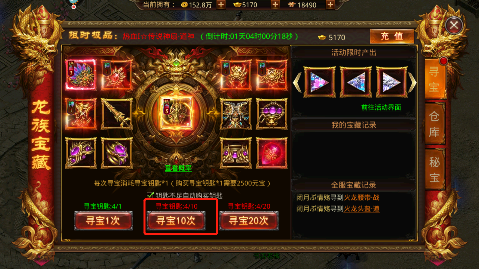 抽奖的模式一共有三种,分别是单抽、十连抽和五十连抽,这里建议大家选择后面的两种,因为单抽是没有任何保底的,而十连抽和五十连抽分别有一件神装保底和六件神装保底,并且十连抽和五十连抽的元宝花费要比十次单抽或者五十次单抽花费的少得多,攒足了更多元宝去连抽是最稳的抽奖方式。