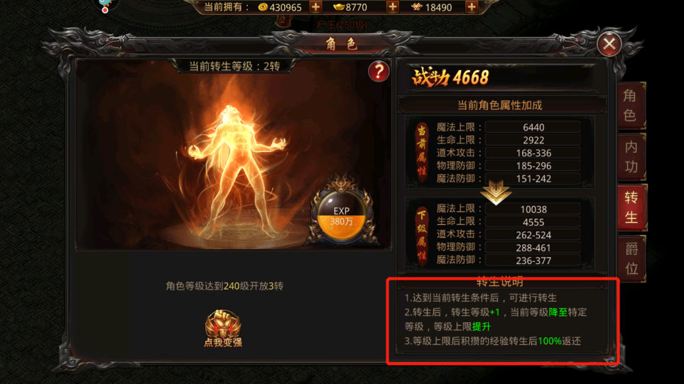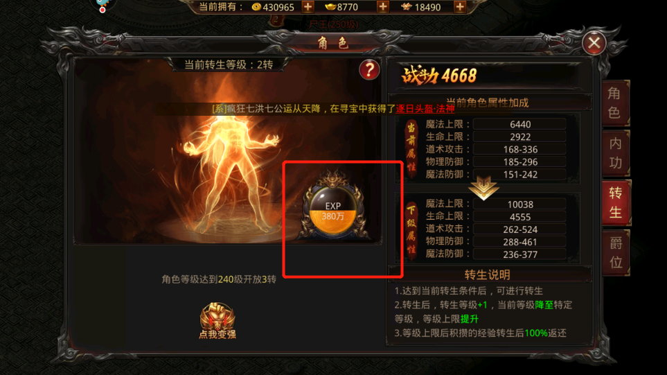 2、使用转生经验丹获取经验