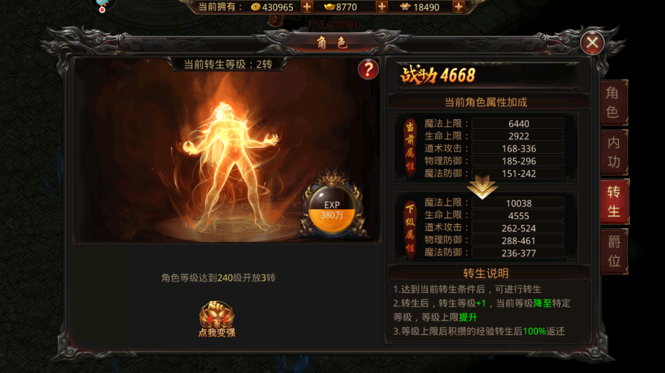 每一次转生对玩家的等级都有限制,第一次转生需要达到一百五十级,第二次则需要二百二十级,以此类推到第二十转的时候需要达到一千五百级左右。想要快速升级的话就建议大家多去打一些副本,做主线任务,然后把每天十次的经验任务认真完成就可以了。