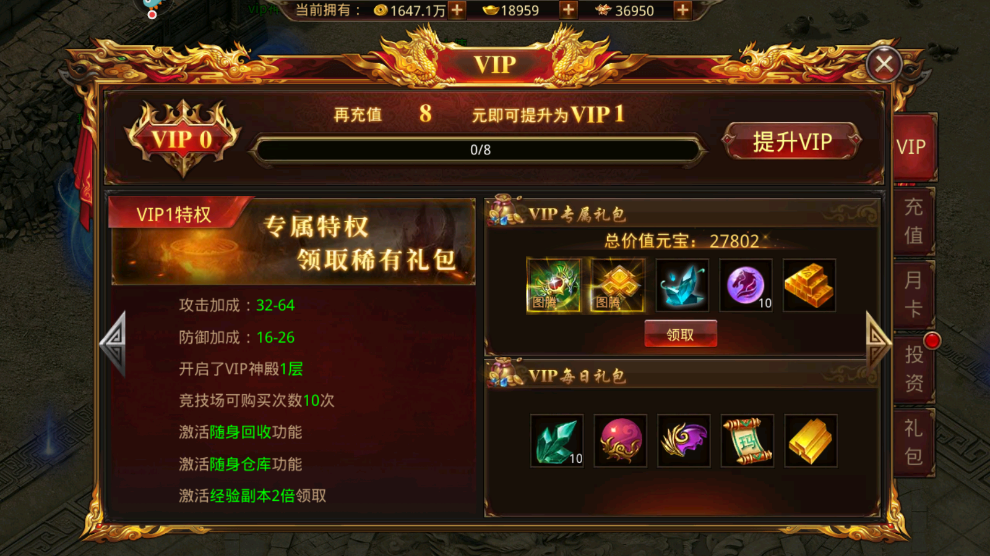 进入诅咒之地之前,大家最好先有一个VIP,不仅因为VIP是开启元宝buff的重要条件,更重要的是VIP是开启随身装备回收和随身仓库的重要条件,在诅咒之地里爆出来的装备会放在背包里,而爆的多了背包装不下,就需要放在仓库或者回收,如果没有VIP的话就需要传送出去找回收官或者仓库,这样再回来需要再支付门票。