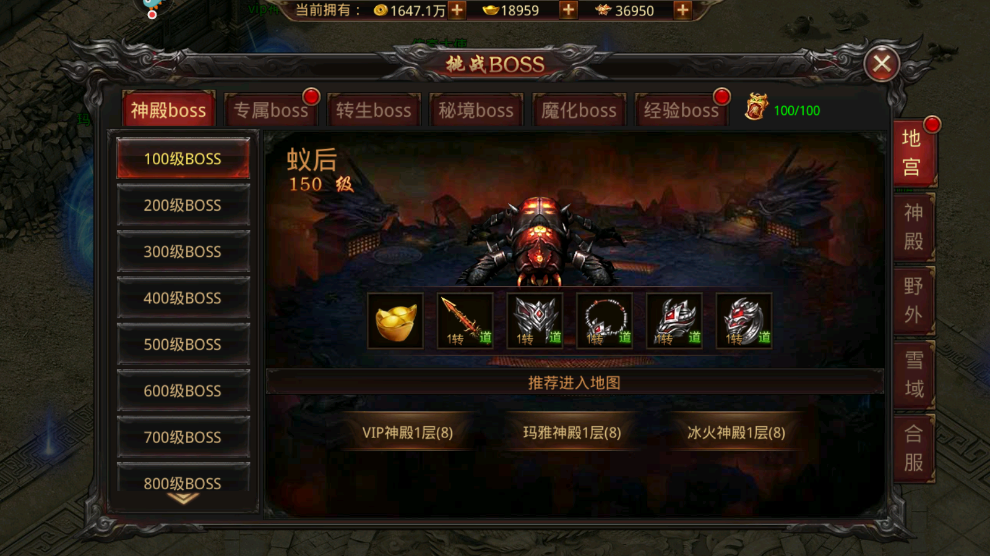 诅咒之地的boss都有严格的等级界限,高一级的boss要比低一级boss的产出好很多,但是挑战难度也大很多,建议大家跨级别挑战其他的boss,方法就是使用太阳神水,开启自动回复功能,设置一下血量下限以后就能一边使用血药一边站撸boss了,这样可以打比自己高一百级左右的boss,获取的奖励更多。