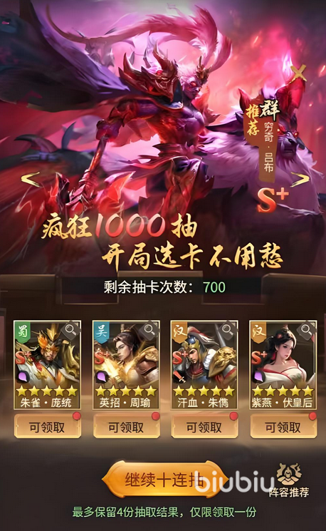 每次签到除了领取到神将之外,还有丰厚的养成道具奖励,例如首日的二十连抽,后续的每天十连抽等,仅仅是领取就可以得到110抽,在卡池中可以放心去招募武将。第2个活动是疯狂1000抽,玩家每日登录可以通过此活动获得大量抽卡次数。在当前轮次中可以进行模拟十连抽,然后从中选择一个获得。大家可以利用这个活动来快速组成自己的阵容,直到抽到满意再去选。