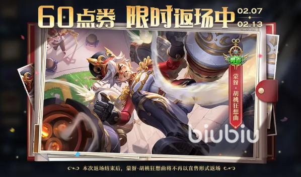 时间为2月7号更新后到2月13号,秒杀返场价格为60点卷,本次返场结束这款皮肤将不再以直售形式返场,在这个时间大家还会迎来英雄苍的折扣,原价18888金币,活动期间只要13888金币。