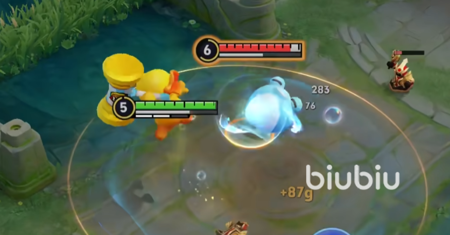 B.Duck,小黄鸭,可以挥动充气锤将敌人捶起来,小技能则可以向着指定方向三连锤击,有伤害有减速,还可以将敌人变层玩偶,然后一锤子打回泉水。