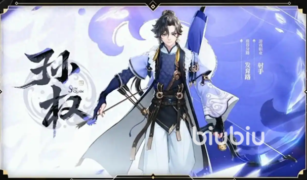 孙权的耳朵上带着耳环,手中拿着弓箭,定位为射手,他的被动是在每次进行攻击的时候,会对敌人打上标记,中标记的敌人,后续对自己的伤害将会减少,如果叠满五个印记可以帮助解锁大招。