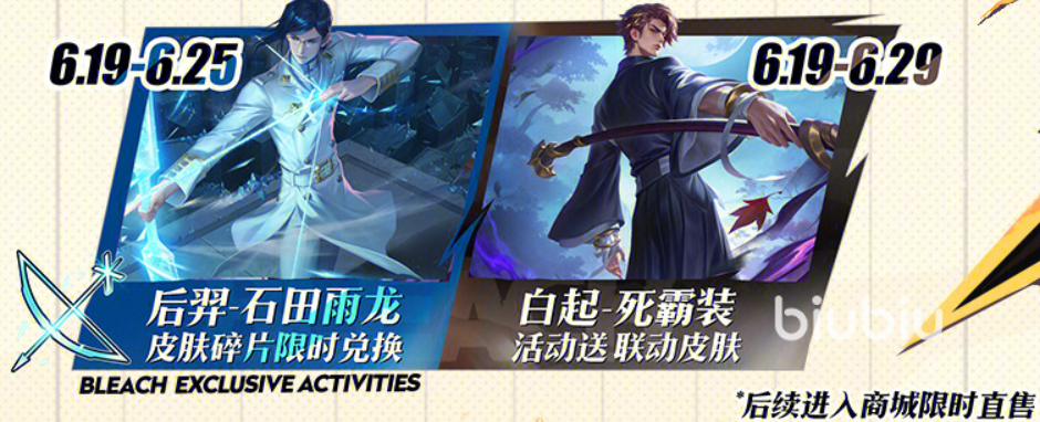 白起·死霸装(勇者限定),还原千年血战篇中的“死霸装”一护的造型,可通过联动活动免费领取,后续于6月30日~7月22日会在商城限时上架(488点券)。后羿·石田雨龙(史诗限定),石田雨龙风格后羿,刚好两位都是用弓箭的,首周88皮肤碎片兑换免费,6月26日起商城直售(首周710点券,后续888点券)。