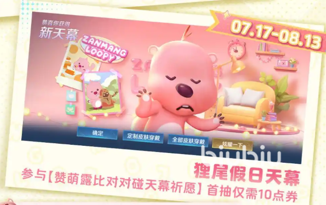 本次更新还带来了一大波粉色系全新内容,可谓是女性玩家们的专属节日。从7月17日起,粉色狸尾假日天幕正式上线,通过参与天幕祈愿抽奖活动即可有机会获得。这款天幕以粉嫩温馨为主色调,为游戏画面增添了梦幻般的浪漫气氛,是搭配Loopy联动皮肤的绝佳选择。