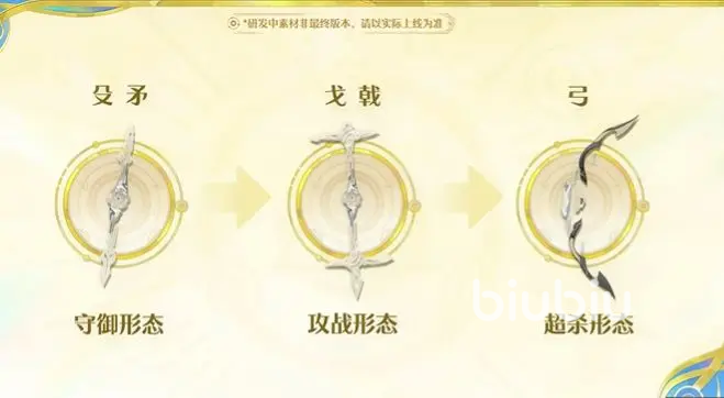 攻战形态:更适合中距离展开战斗,1技能”戈锁九泉“,使用戈钩对终点方向位移。2技能"戟荡八荒",对前方对手进行范围横扫,也能附加回复效果,增强她的续航能力。超杀状态:擅长远距离战斗。