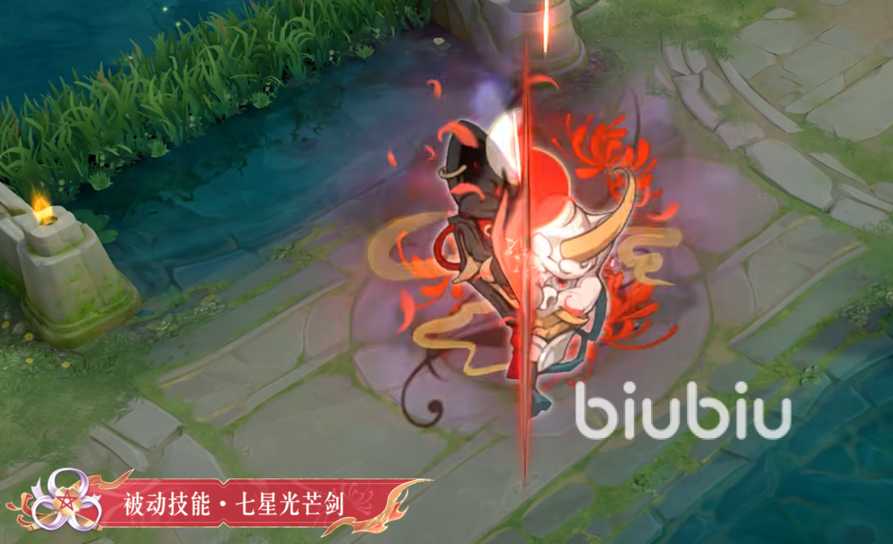 此皮肤的亮点在于它会有两种颜色的技能特效,一个是以蓝色为主另一个是红色为主,代表了不同的元素,其中红色的被动技能是施展七星斩击之后会呈现出被劈开的恶魔面具,周边还会带有彼岸花特效。