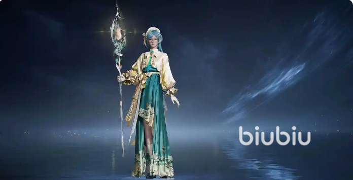 王昭君的这款皮肤古风感十足,配色以暖金和绿色为主,长发及腰,手持星盘法杖,星光环绕,中式马面裙,配合中式的上衣,十分有气质,与角色本身很是贴合。