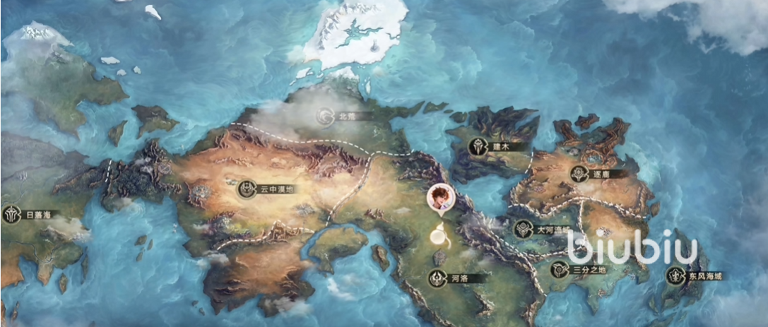中部还有稷下和云中漠地;最后一块就是西部和北部地区,第一个是日落海,在大陆的西北侧,是海洋城邦,西方奇幻风格,核心为海都,日落圣殿,王者峡谷;北荒在长安以北,主要是冰原荒漠,极北很是苦寒;最后的大河流域,也就是云梦泽,在稷下以南,是沼泽湿地。