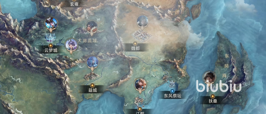 首先是东部地区,三分之地:在大陆的东南方,也是新手出生区域,聚集了三国文化,有水乡,关隘,战场,核心就是魏蜀吴的城池,赤壁,长坂坡,代表英雄有孙策,孙尚香,刘备,吕布这些;