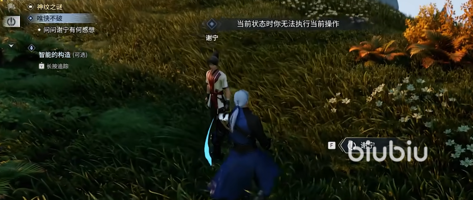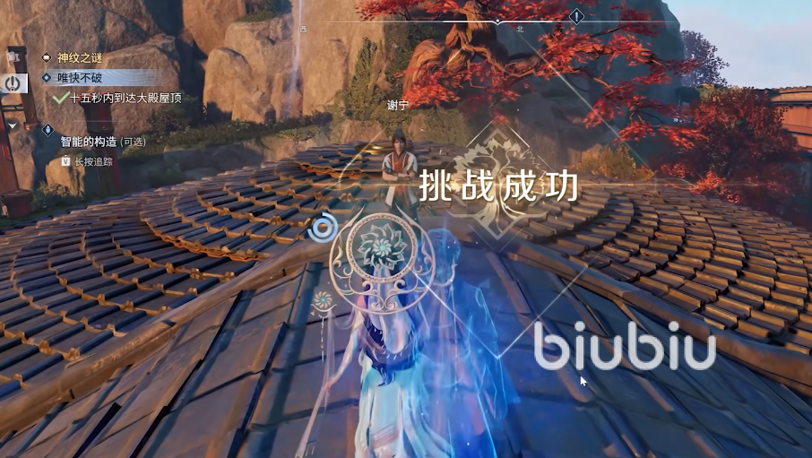 完成挑战之后,解锁新的地点,是刚才门牌的位置,利用勾锁跳上去后开始新一轮的挑战,需要跟着NPC谢宁一起走,不愧的人机,位移速度非常快。到达小山坡后可以通过对战的方式来阻止他继续前进,然后按照要求再回到门牌处,找李善风回话就完成了整个任务。