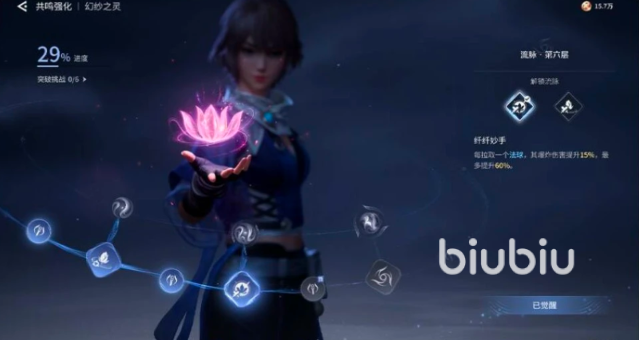 目前养成分为四种,每一种对角色而言都是至关重要的,多维度养成,才能让一个角色成长的强大。先看第一个“流脉”,这是英雄共鸣的额外战斗能力,需要升级解锁不同流脉分支进行搭配,就能解锁英雄额外能力,比方说“增加法球”,“增加爆炸伤害”诸如此类。