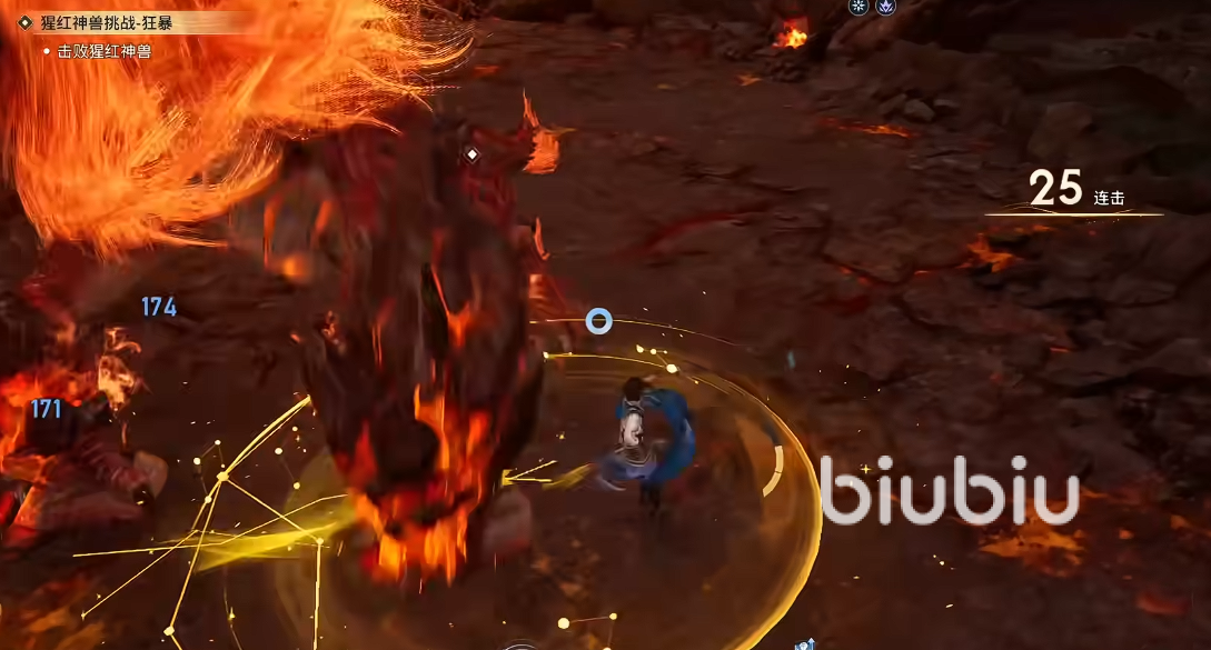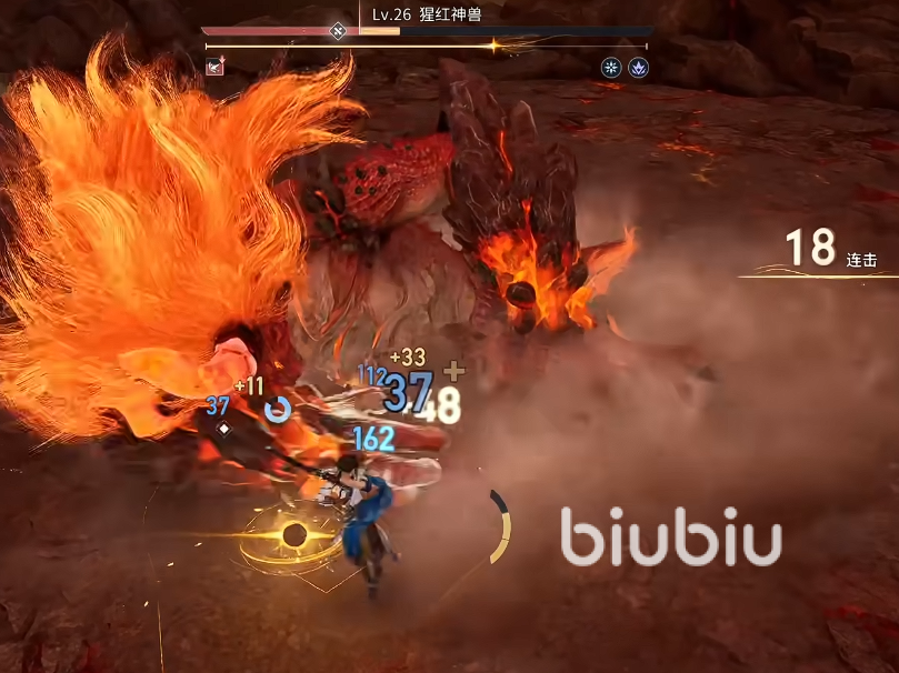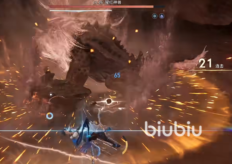 然后还需要去了解boss的机制,比如说去打猩红神兽这个boss的时候,其尾部是最脆弱的,所以需要玩家们去该boss的尾部进行攻击,大概攻击几秒的功夫,该boss就会往下攻击释放一道熔浆,这时候就可以直接闪避,会出现明显的闪光状态,该状态是可以提供几秒无敌的,然后再进行反击就能保持无伤,而且连击次数也会一直存在。