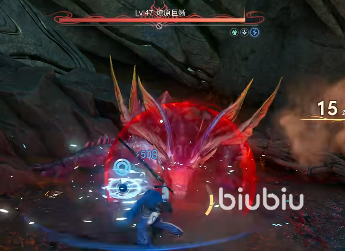 需要重点应对的核心技能有四个,第一,燎原横扫,怪物的前爪大范围横向挥击,有明显抬爪前摇,向boss身侧闪避即可无伤规避,二,熔岩吐息,头部红光蓄力后向前方扇形区域喷射持续火焰,地面会残留熔岩区,踩中会瞬间叠加两层灼伤,看到蓄力动作立刻向boss身后位移,三,地火喷发,地面出现多轮红圈预警,延迟后喷发地火,须连续短闪规避,完美闪避可触发反击,短暂打断boss动作,四,遥远怒焰,血量低于30%时触发的全屏aoe技能,硬抗会被直接秒杀,需立刻躲入场地边缘的岩石掩体后,或者使用护盾类技能全额抵消伤害。