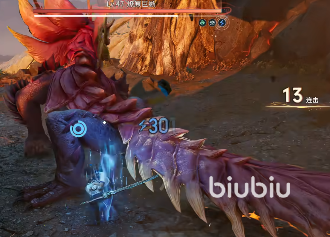 燎原巨蜥的核心威胁来自火属性攻击,所有伤害都会附带灼烧的buff,不仅持续扣除生命值。还会降低50%治疗效果,叠加三层后还会触发爆炸伤害。其核心弱点为腹部软甲与尾部火囊,持续攻击弱点可快速削减破势条,破势条清空后,boss会进入长时间僵直倒地的状态(承受150%额外伤害),该状态是整场战斗的核心爆发窗口。