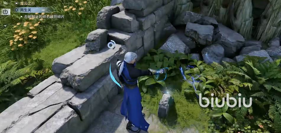 根据对话内容需要玩家找到2个关键道具。第一个道具的位置就在刚刚清小怪的地方附近,击碎一个大石堆后就能领取到。第二个石块道具的领取方式就比较复杂了。先要来到巨石阵正前方的机关处,触发机关【踏霄阵】,机关触发后石块开始位移升降,这个时候玩家需要踏上石板并随着它的位移来前进,直到能到达目标位置。玩家如果熟悉滑索操作的话,能利用滑索快一点到达位置。
